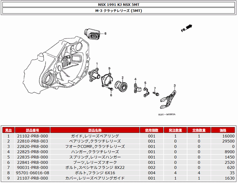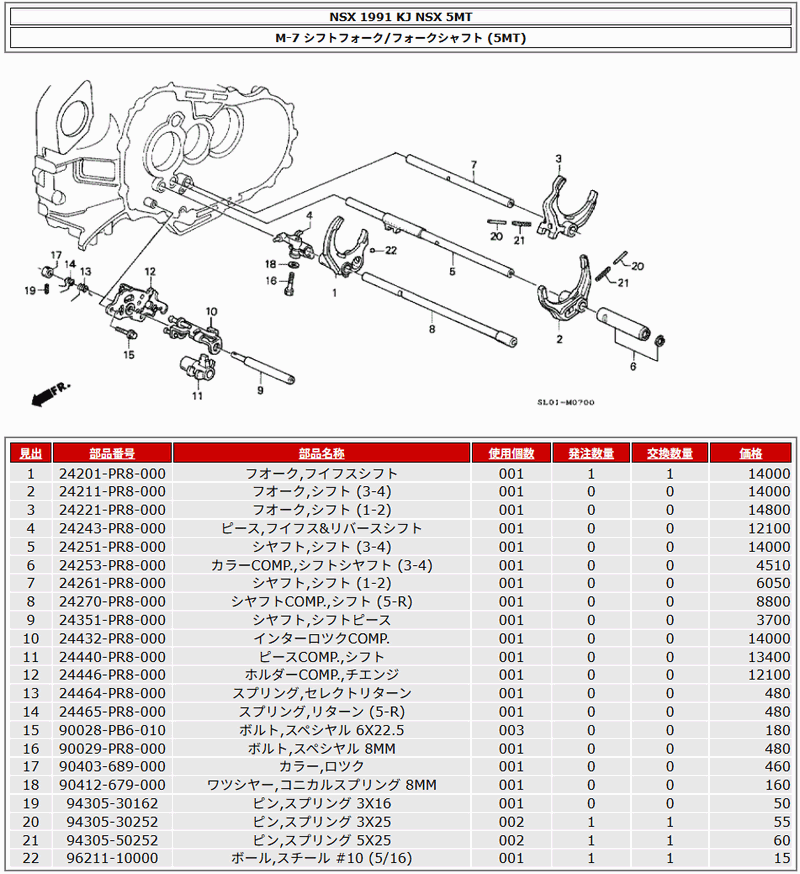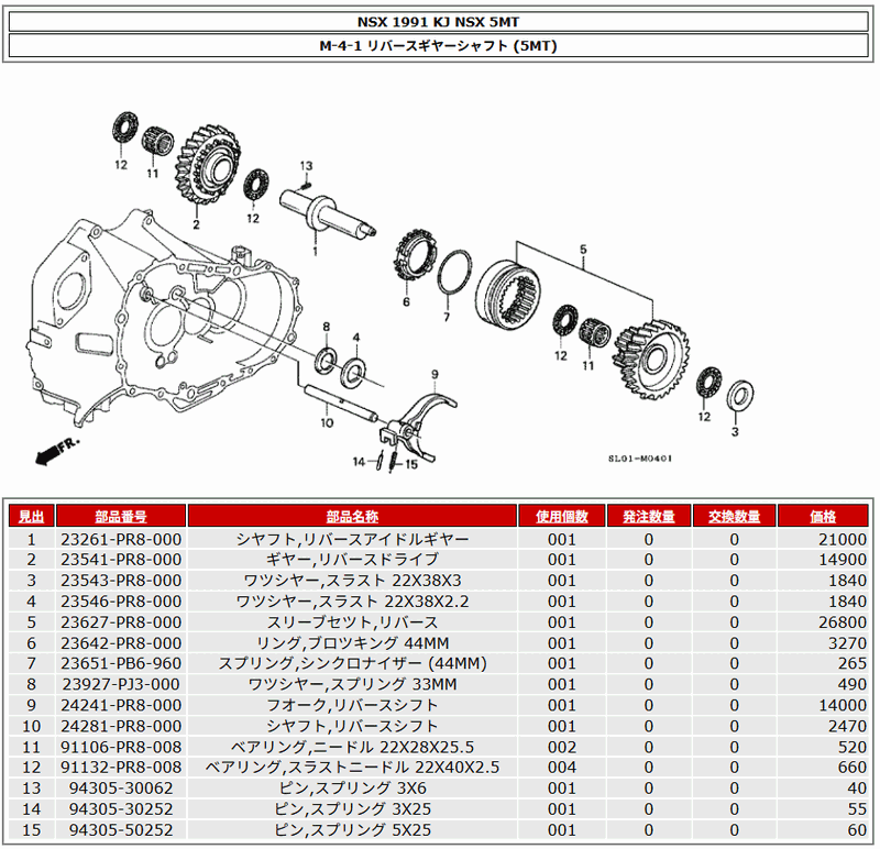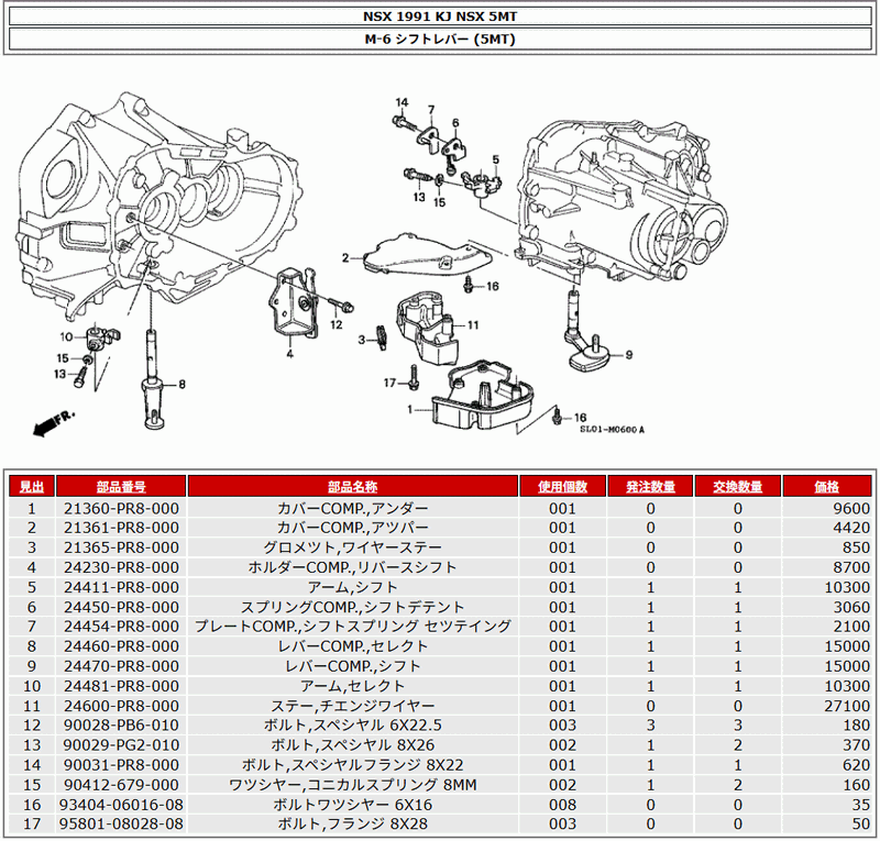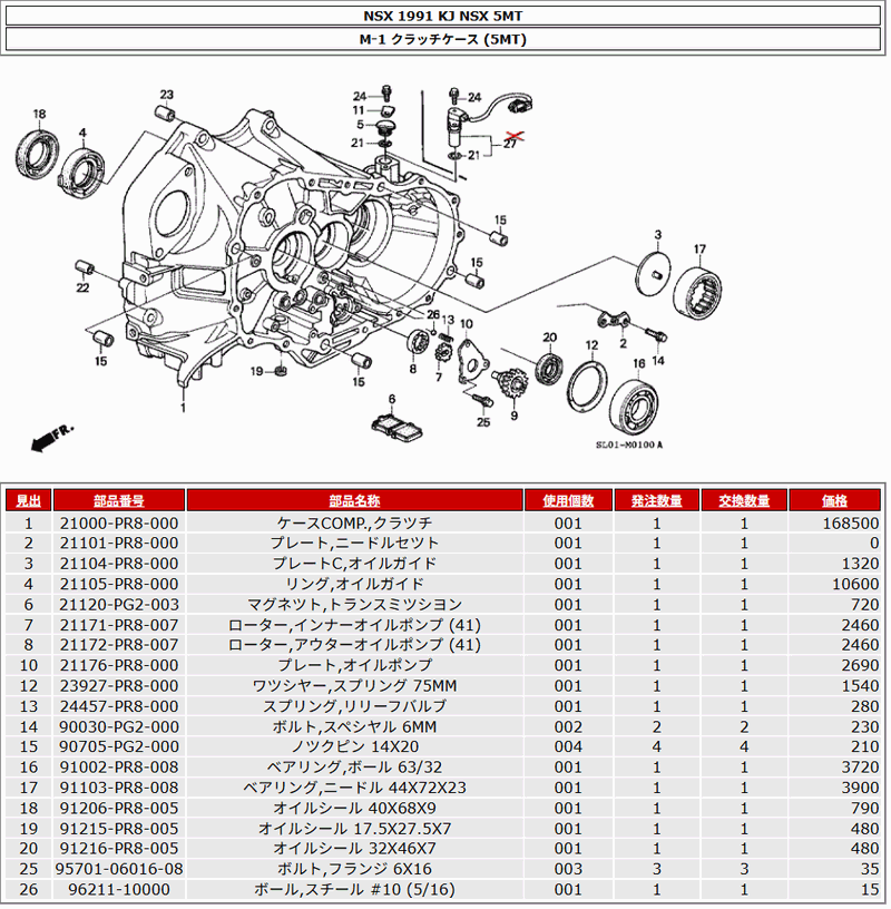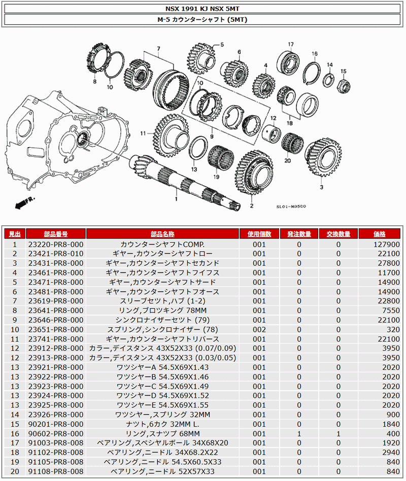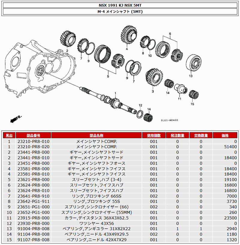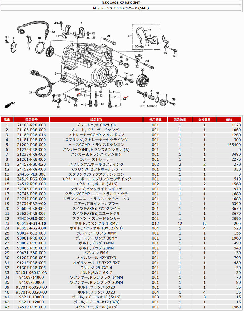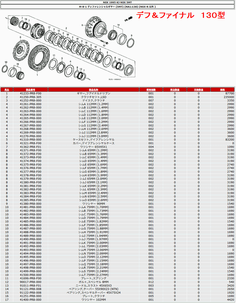 マリオさんは もしかして以前 蜂蜜をいただいた方でしょうか。 そうだったら その節はありがとうございました。 で、ミッションですが これは 初期型の5速だと思うけど デフは130型みたいで ボルトが入ってないから仮組み状態に見えます。 上のイラストとリストが 5速ミッションの構成部品ですが 写真を見て予想しながら 必要かな・・と予測できる部品のところに 発注&交換数量の数を入れました。 クリアランス調整用のシムと シンクロなどの消耗品は拾っていません 5速のシフトフォークは強化対策品が出てるので 交換推奨です。 21176-PR8-000 プレート,オイルポンプ 21104-PR8-000 プレートC,オイルガイド 21232-PR8-000 ハンガーCOMP.,トランスミッション これらは純正部品が絶版状態ですが T3TECで互換品を作っています。 https://www.nsxnet.com/search_result.php?cat_search=1&catid=22&subcatid=147 を、参照 と、言う感じですが 5速ミッションは 130型からLSDの構造が変わっているし この写真の部品を使って 消耗品を交換しつつ ミッションを1機組み立てるには それなりに知識が必要になってくると思います。 可能なら 部品一式を送ってもらって こちらで組み立てて送り返した方が確実ですが ポーランドですよね・・ 輸送手段に心当たりがないので 地元で頑張ってみるのなら部品情報はnsxnetをご活用ください。 ところでこのミッションを使って AT→MT換装をやろうというわけでしょうか・・ それはそれで 部品選択と実作業で 非常に苦労すると思います。