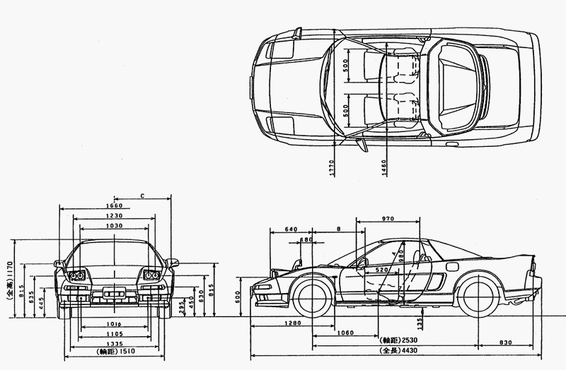 上のイラストがNSXの三面図ですが これで見ると 最低地上高はサイドシルのジャッキアップポイントということになりそうです。 でも実際には エンジン下の リアビームロッドの方が低いことが多いし 路面に当たりやすいのもここです。 だけど車高って 車重とスプリングの反発力のバランスしたところで決まるものだから 左右車重の違いも大きいし部品の個体差もあるし メーカーの狙ったとおりにはいかないものです。 諸元表では最低地上高135ミリでも 現車はもっと高い・・ということが多かったと思う。 だから アフター業界のサスペンションキットは 好みのバネレートと車高が調整できるように ネジ式の車高調キットが多いわけですけど。 NSXの車高の決め方・・は オーナーの好みや走行条件によって大きく変わるわけで 私はサーキット走り回ってた頃 フロントの車高を生活限界くらいに下げておいて リアを上下させて操縦性の良いところを探っていく・・という方法でした。 車高の前後バランスは操縦性に大きく影響します 見た目でリア下がり姿勢かな・・くらいが アクセルオフでテールの流れが穏やかになるし 立ち上がりで大きくアクセル踏めるしサーキットでは具合が良かった。 足回りが大きくストロークする一般道の走行では 車高を下げるほど サスペンションアームの動きは悪くなるので ノーマルから20ミリダウンくらい位が 見た目と足回りの動きを考えると良いところかな・・と思う。 と、言う感じで 私の場合 走行フィール優先で見た目はあまり拘らなかったけど ルックス優先でフルエアロ・・ということなら タイヤ外径とフェンダーのスキマなど 見た目優先で決めていくことになるんでしょうねぇ。 下げすぎれば 路面の突起物にぶつかることもあるでしょう。 突起しているマンホールなんかに強烈に当たれば 深刻な損傷になる・・かもしれませんね。