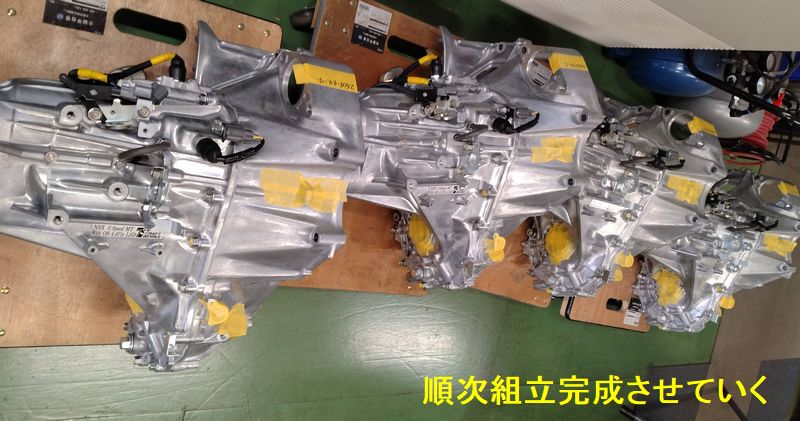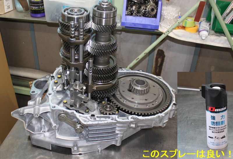 今年2回目のフル新品6速ミッション組立作業。 これで今年10機目です 今回は全て OS4.4ファイナルスーパーロックLSD仕様 6速ミッションはずいぶん高くなっちゃったんだけど それでも 欲しい人は多いわけで 需要は続いてます。 ミッションを組み立てる際 要所要所オイルを塗るわけで いつも ホンダ純正ミッションオイルMTFVを油差しに入れて使っていたんですが うちのファクトリーで常用している スプレーオイルを試しに使ってみたところ これが非常に具合が良くて手放せなくなった。 大東潤滑というメーカーの Dmaxと言うシリーズの強力防錆剤スプレーなんだけど ベアリングとミッションケースとか 鉄とアルミの囓りやすい嵌合部分なんかに使うと抜群によく滑ってくれる。 クラッチ側ミッションケースにメイン&カウンターシャフトを組む時 リバースギアとシャフトを組む時 そして 最後にミッションケースを組み立てる時 要所要所にこのスプレーを少しだけ吹いておくと 実に滑らかに組立が出来るから 作業が凄く快適になった。 本来の用途は防錆剤だから このスプレーオイル 揮発しにくくて 鉄部品に吹きかけておくと 長期間錆を防止してくれるらしい。 へぇ・・こんな良いものがあるんだなぁ。 そんなわけで 今年10機目の6速ミッションが完成 みな売約済み状態で 予約分はまだあと5機くらい組まなきゃならないんだけど しばらくは このミッションを搭載する作業とMT換装作業を行っていくことになります。