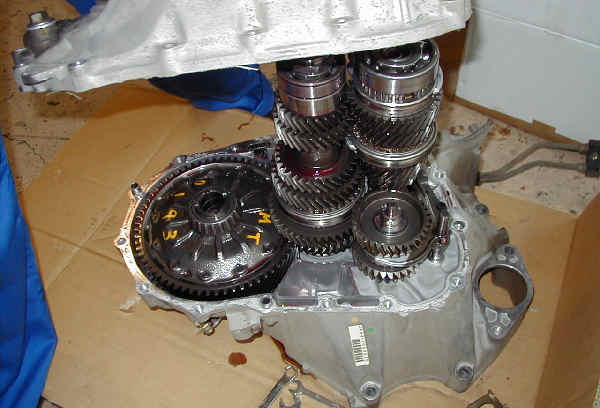 左のカウンターシャフトに切られた太いギアがデフのファイナルドリブンギアと噛み合って